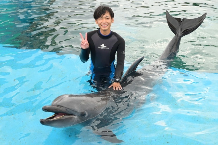 バンドウイルカのくらす世界へ飛び込んでみませんか?普段はアクリル越しにしか出会えないイルカたちが、皆さまのすぐそばまでやってきます。夢のような30分間をお楽しみください。