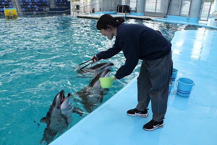 解説のあとはカマイルカに魚を あげる体験ができます。