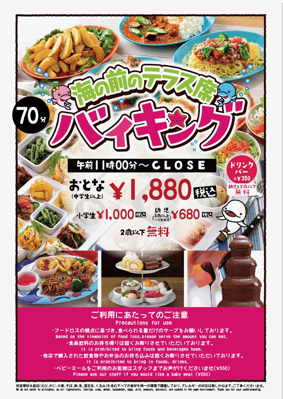 海辺の光がふんだんに満ちた明るい店内。潮風が心地よいウッディーテラスでシェフ手作りのバイキングをお楽しみください。