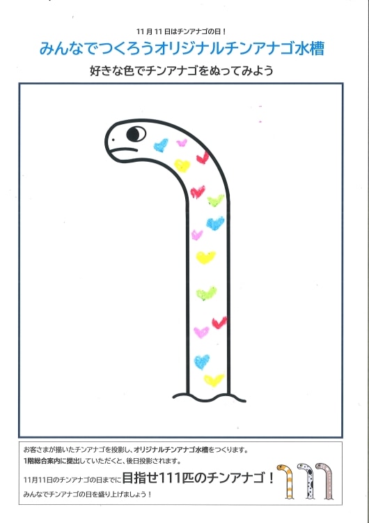 また、チンアナゴのイラストフォーマットをうみの杜公式ホームページにてダウンロード・印刷していただき、お客さまが色を塗ったチンアナゴを1階総合案内に提出していただくと、後日大水槽からクラゲのいやしにつながる通路投影されます。