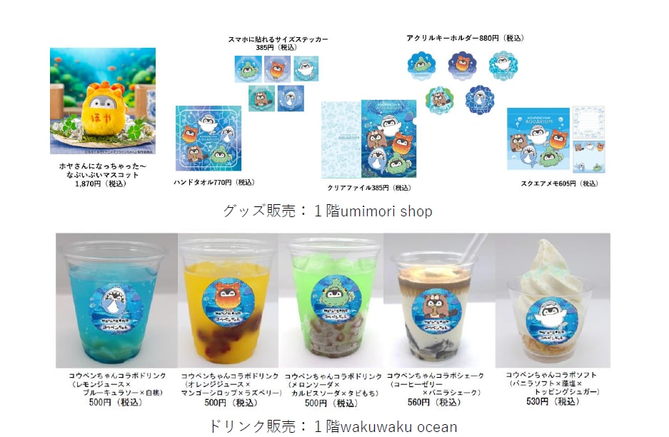 今回のコラボのために描き下ろされた限定イラストを使用した、ここでしか手に入らないオリジナルコラボグッズを多数販売する「限定SHOP」がオープンします。文具、雑貨、ぬいぐるみなど、コウペンちゃんと仙台うみの杜水族館の生きものたちの可愛らしいオリジナルの商品を販売します。また、コウペンちゃんの世界観を表現した、コラボドリンクを提供します。