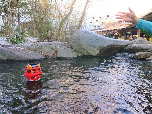 カプセルトイで販売しているコイのごはんを豆に見立て、鬼の面に向かって“豆まき”体験ができます。コイたちにごはんをあげて、福を呼び込みましょう!